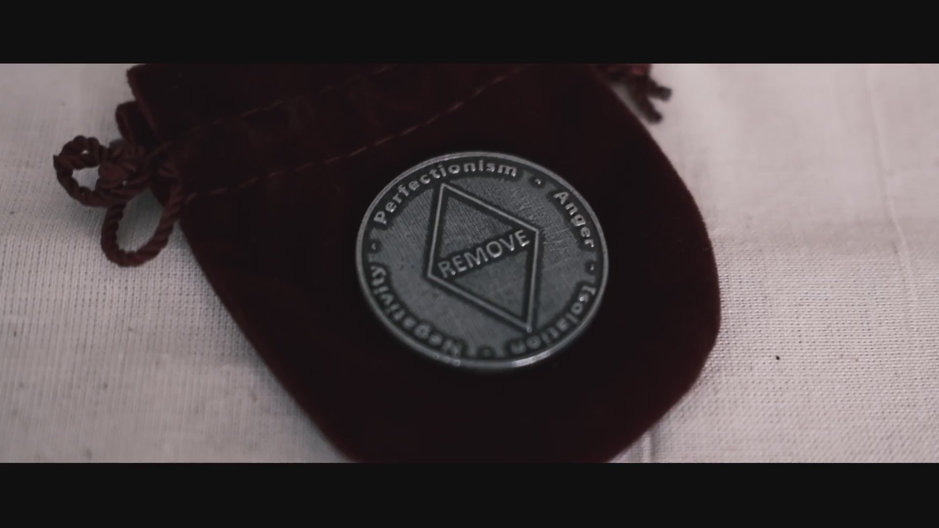 From within the final, smallest packet, the performer removes and displays a pewter oracle token, which they explain is used to understand the positive and negative aspects of our lives.